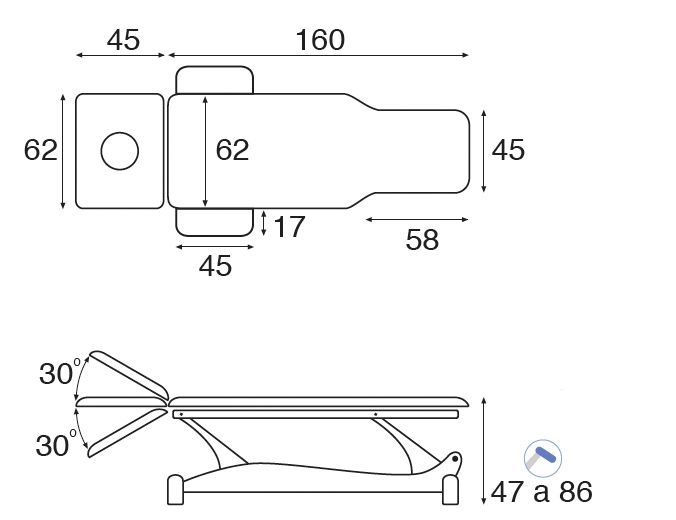 - Hoofdsteun verstelbaar tot 30 ° omhoog en 30 ° naar beneden
